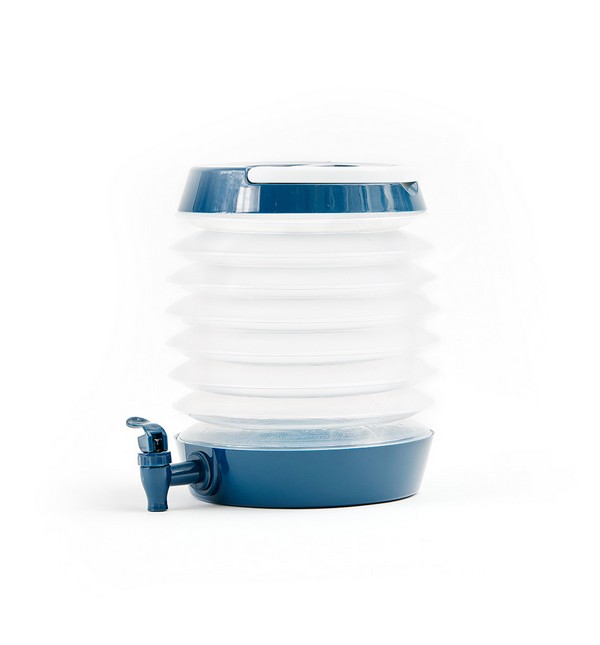 Ihopfällbar behållare med tappkran. Enkel att fylla på i den stora öppningnen i locket. Du fyller på ditt glas genom att trycka ner knappen till tappkranen. Platssparande och därav praktisk att ha med på picknicken eller då man campar. Strl. 5,5 L. Förp.