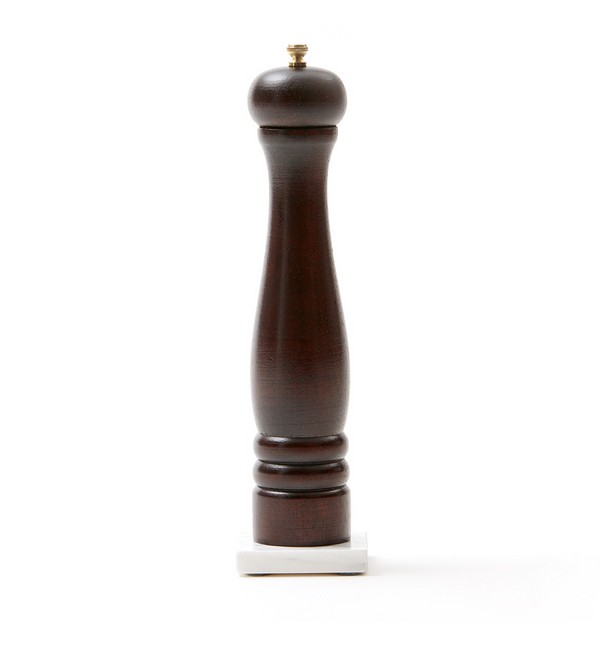 Gedigen pepparkvarn i mörkt trä. Kvarnen har högkvalitativa keramiska verk och kommer med en passande marmorskiva till så att ni slipper spill från kvarnen på bordet. Strl. 31×6 cm • 8x8x1,3 cm. Förp. Presentkartong.